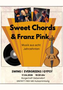 Sweet Chords & Franz Pink – ein Abend voller Swing und Evergreens! Gemeinsam mit dem virtuosen Geiger und Multi-Instrumentalisten Franz Pink präsentiert die Band „Sweet Chords“ Klassiker aus acht Jahrzehnten Musikgeschichte.